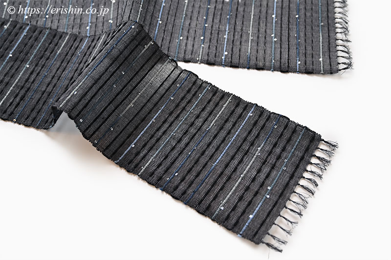 誉田屋源兵衛 半幅帯(芭蕉段織/墨黒・藍鼠の縞とスパンコール)