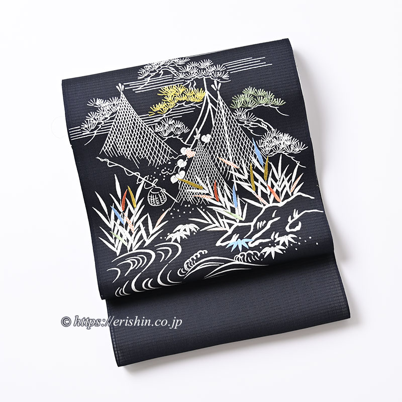 染名古屋帯(網干や葦の水辺の風景/藍墨茶・紗紬)[夏・単衣向]