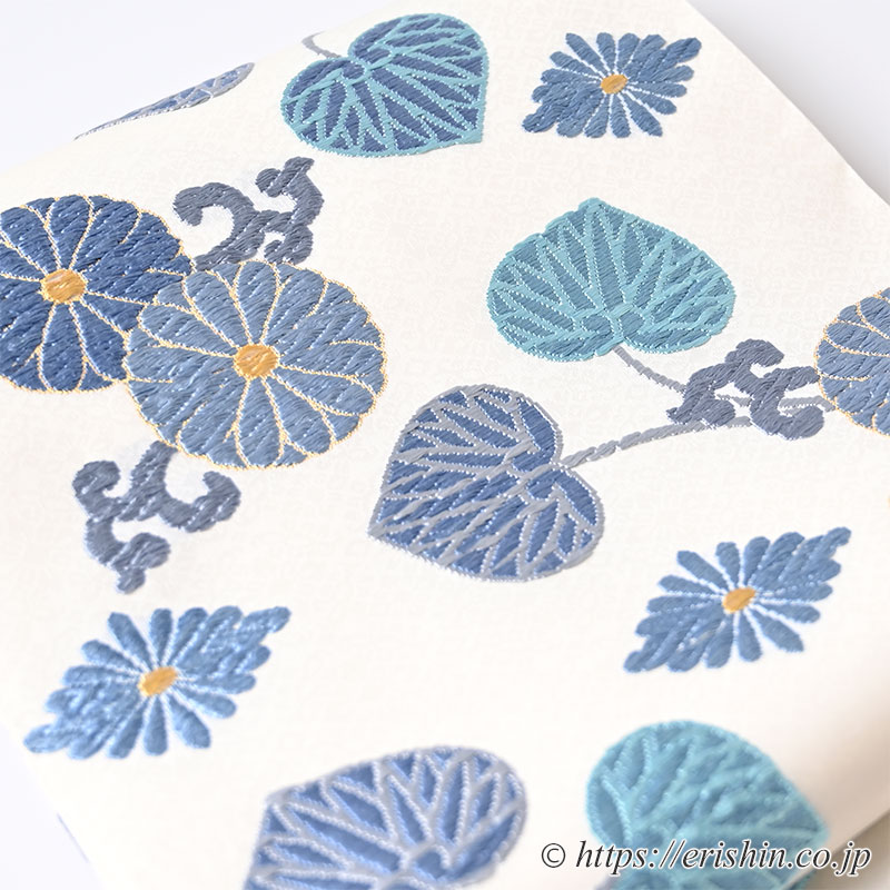 袋帯(菊葵文・唐織/白地に青藤色や青磁色)「着物と帯・呉服えり新」