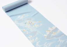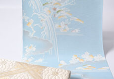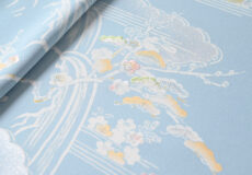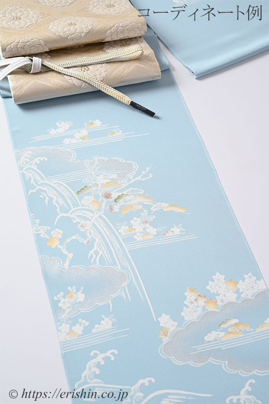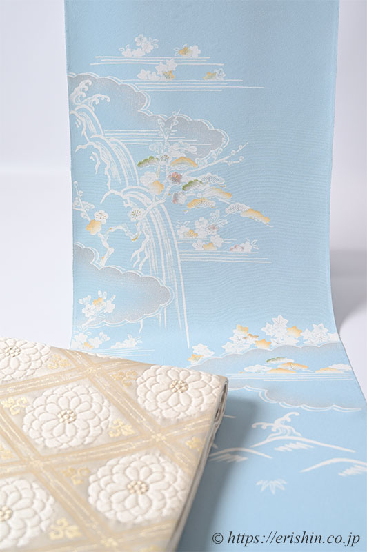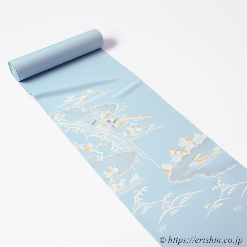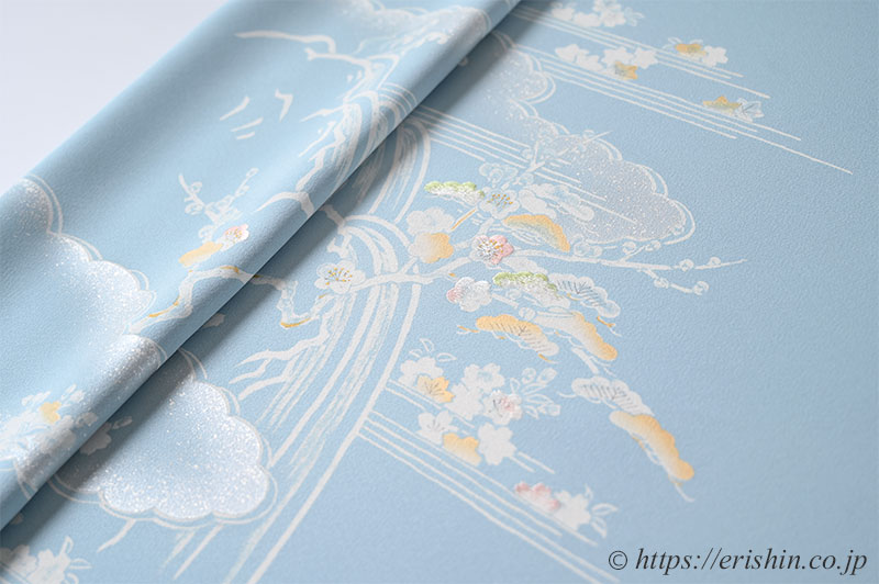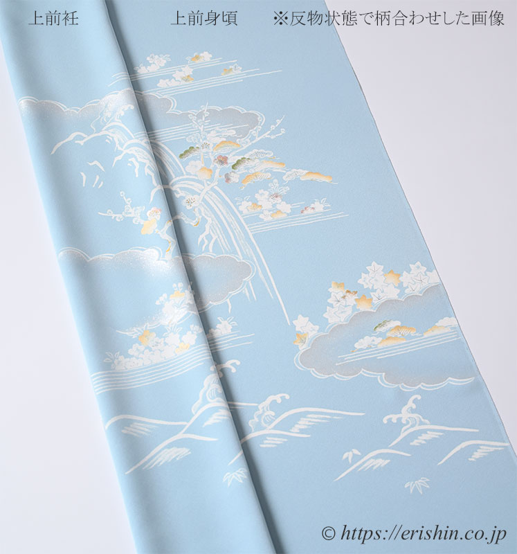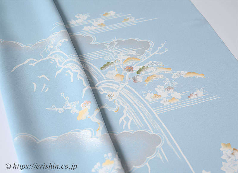 柔らかく白みを帯びた水色(白群色)の地に、白で筆で描いたような御所解き文様が本当に綺麗。